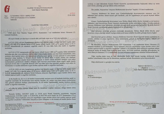 Söz konusu düzenleme, “bizzat kullanma amacıyla engelliliğe uygun hareket ettirici özel tertibat yaptıran malul ve engelliler” ifadesiyle, %90’ın altında engelli raporuna sahip bireylerin de ÖTV muafiyetinden yararlanabilmesine imkân tanıyordu. Ancak iptal kararının Resmi Gazete’de yayımlanmasının ardından geçen 9 aylık sürenin dolmasıyla birlikte, karar 26 Mart 2026 itibarıyla yürürlüğe girdi.