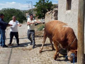 Yozgat’ta uzun yıllar kasaplık yapan Hasan Demirtaş, Abdullah Çakır’ın yetiştirdiği 800 kilogramlık başka bir boğayla büyükbaş kurbanlıkların kesim için nasıl yatırılacağını gösterdi. Büyükbaş kurbanlıkların kolay bir şekilde yatırılmasını uygulamalı olarak gösteren Demirtaş, büyükbaş kurbanlığın 7 ile 10 metre arasında sağlam bir urganla rahatlıkla yatırılabileceğini ifade etti.