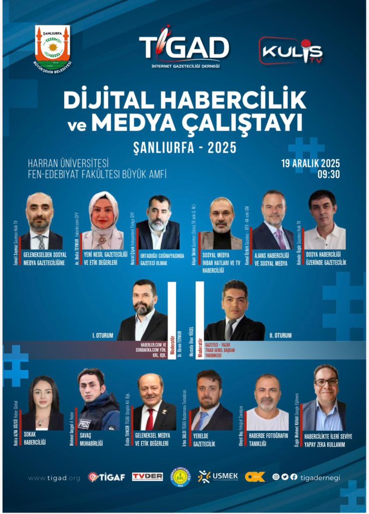 Türkiye İnternet Gazetecileri Derneği (TİGAD) tarafından 18–21 Aralık 2025 tarihleri arasında Şanlıurfa’da düzenlenecek Dijital Habercilik ve Medya Çalıştayı, Türkiye’nin dört bir yanından gelen gazetecileri bir araya getirecek. Dijital gazetecilik, etik, yapay zekâ ve saha haberciliği gibi güncel ve kritik başlıkların ele alınacağı çalıştaya, 70 ilden 120’yi aşkın basın mensubunun katılması bekleniyor.