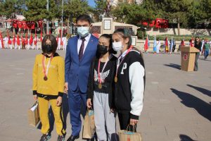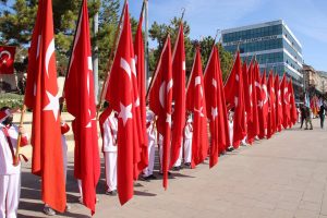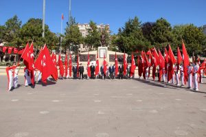 Cumhuriyet Meydanı’ndaki Tören Atatürk Anıtı’na çelenk bırakılmasıyla başladı. Saygı duruşu ve İstiklal Marşı’nın ardından öğrenciler tarafından Cumhuriyet Meydanı’na getirilen Türk bayrağı, Yozgat Valisi Ziya Polat’a teslim edildi.