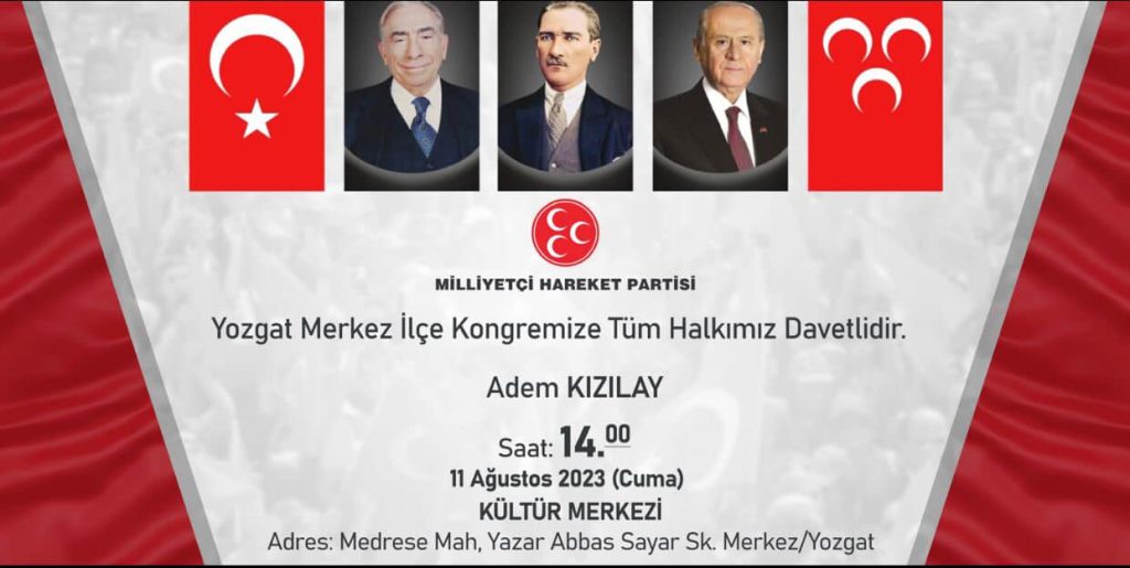 MHP Yozgat Merkez İlçe Başkanı Adem Kızılay, 11 Ağustos Cuma günü Yozgat Belediyesi Büyük Sinema Kültür ve Sanat Merkezi’nde saat 14:00’de yapılacak Merkez İlçe Kongresine Yozgat halkını davet etti.