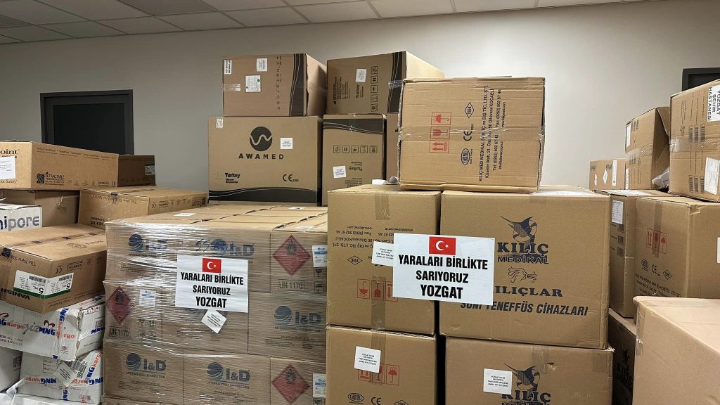 Yozgat Şehir Hastanesi çalışanlarının destekleriyle toplanan; mont, kazak, çorap, atkı, bere, battaniye, gıda malzemeleri, mama, ısıtıcılar, ilaç ve sarf maddeleri kolilerde paketlenerek deprem bölgesine ulaştırılması için yola çıktı.