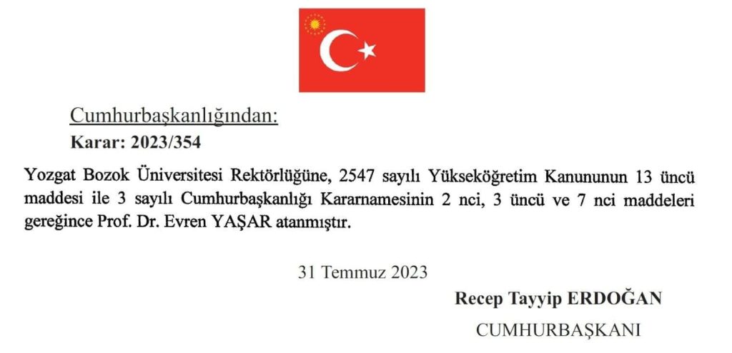 Cumhurbaşkanı Recep Tayyip Erdoğan’ın imzasıyla, aralarında Yozgat Bozok Üniversitesi’nin de bulunduğu 20 üniversiteye de rektör ataması yapıldı. Atamayla birlikte Bozok Üniversitesi’nin yeni rektörü Prof. Dr. Evren Yaşar oldu.