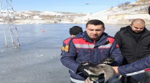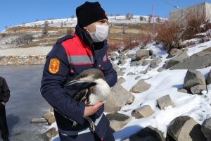 Yozgat’ta buz tutan gölette mahsur kalan ve donmak üzere olan gerdanlı dalgıç kuşunu itfaiye ekipleri kurtardı.