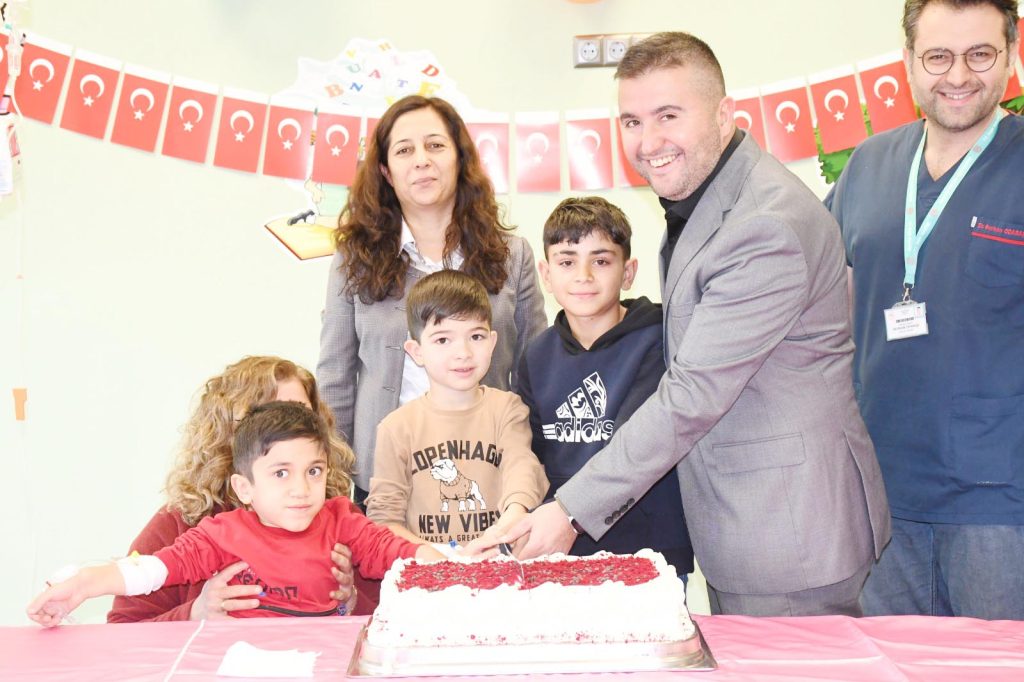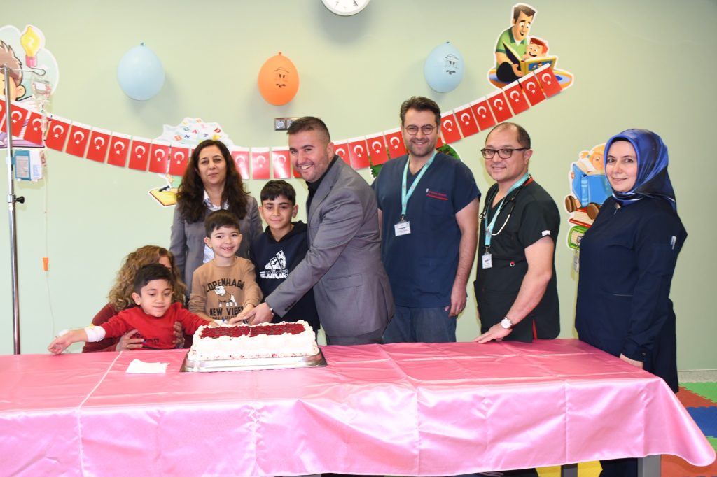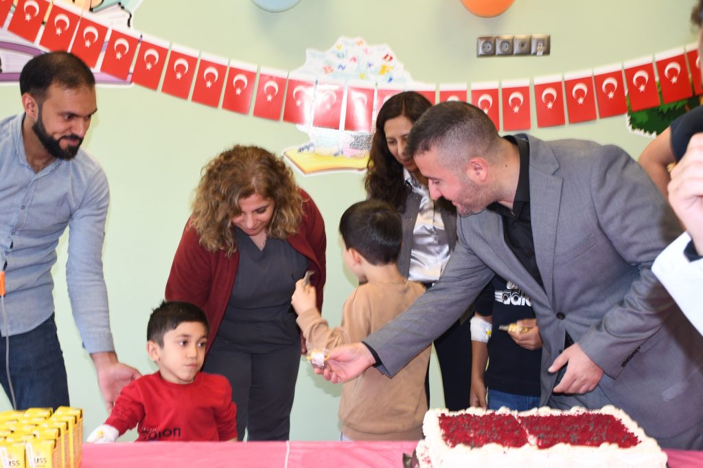 Yozgat Şehir Hastanesinde düzenlenen etkinlikte hazırlanan pasta kesilerek çocuk servislerine ikram edildi.