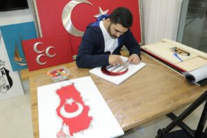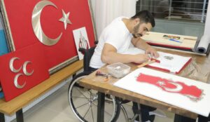 Filografi sanatına 3.5 yıl önce başladığını söyleyen Ceylan, “Ankara’da tedavi aldığım bir hastanenin mesleki rehabilitasyon salonları mevcuttu. Seramik, mobilya boyama, rölyef, filografi ve daha niceleri bir sürü el sanatı atölyesi mevcuttu. Benim de dikkatimi filografi çekmişti. İlk gördüğüm tablo al yıldızlı ak bayrağımızdı. Gerçekten çok hoş görünüyordu. Daha sonra ben bu sanata merak sardım, hobi olarak başladım. Hastanedeki hocamın da yardımıyla yavaş yavaş bu sanatı öğrenemeye başladım. Akrabalarıma, akrabalarıma hediye olarak yapmaya başladım. Bu da beni biraz daha keyiflendirdi. Artık benim için bir uğraşa dönüştü, hobiden ziyade. En azından bana engelimi unutturdu. 4.5 yıl oldu ben yaralananalı. 3.5 yıldır da bu sanatla ilgileniyorum. Bu zamana kadar 50 ila 100 arası tablo yaptım. Hepsi de birbirinden değerli bayraklar, sancaklar, üç hilaller. Gerçekten bana zevk veriyor, huzur veriyor. En azından evde boş boş oturmak yerine bir uğraşım olduğunun farkına varıyorum. Bütün engelliler bir sporla uğraşla kendilerini motive etmeli. Ben yapım gereği çalışmayı seven bir insan olduğum için boş duramıyorum. Siparişler geliyor, yeri geliyor siparişlere bile yetişemiyorum” diye konuştu.