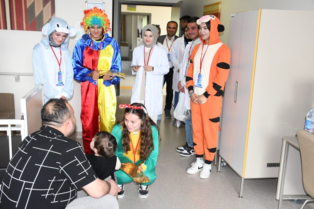 Etkinlik çerçevesinde, YOBÜ öğrencileri Şehir Hastanesi’nin süt çocuğu servisi ve çocuk polikliniğinde yatan çocuklara çeşitli hediyeler takdim etti. Bazı öğrenciler, çocukların hayranı olduğu çizgi film karakterlerinin kostümlerini giyerek oyunlar oynadı, şarkılar söyledi. Miniklerin yüzlerinde tebessüm oluşturan bu anlar, hem çocuklar hem de aileleri için unutulmaz birer hatıraya dönüştü.