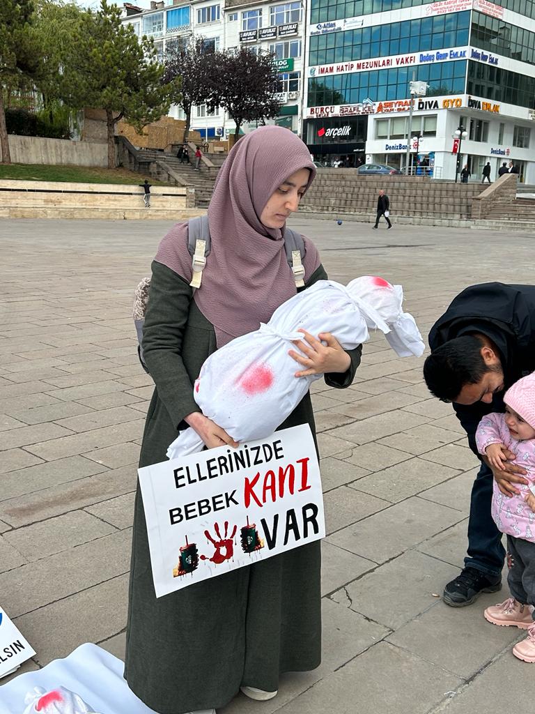 Yağmur,”Siyonist İsrail, 37 gündür çoluk çocuk demeden Filistinli masum sivilleri katlediyor. Bu katliamda da en çok çocuklar, bebekler şehit ediliyor. Anneler şehit ediliyor. Eli silah tutamayacak olanlar şehit ediliyor. Bu katliamı tekrar hatırlatmak, göz önünde bulundurmak, bir farkındalığı oluşturmak anlamında bugün burada bir mizansen dahi olsa, bebekleri, bebek ölümlerini canlandırmak istedik. Kardeşlerimiz, ben annelerden böyle bu yerdeki yavruları şöyle bir alıp hani bunlar bir yapay da olsa, şöyle bir kucaklarına almalarını sanki kendi evlatları şehit ediliyormuş gibi, kendi evlatları öldürülüyormuş gibi o annelerin yaşadıklarını hissetmelerini bekliyoruz, istiyoruz. Ve hani biz bunun neresindeyiz? Biz bu işin ortağı değiliz diyenler de bu ürünleri alarak İsrail’in ürünlerini alarak onlara maddi anlamda destek olarak bir kurşun, bir bomba, bir füzede onların eliyle o çocukların şehit edildiği, o çocukların öldürüldüğünün farkında olmalarını istiyoruz. Bu belli ki daha devam edecek bu süreç. Dünya sessiz kaldıkça bizler buna duyarsız kaldıkça, bu süreç yaşanmaya devam edecek. Biz de bu yaşanmaya devam ettikçe İsrail’in barbarlığını, zulmünü ve soykırımını halkımızın gözü önünde tekrar sergilemeye devam edeceğiz.”diye konuştu.