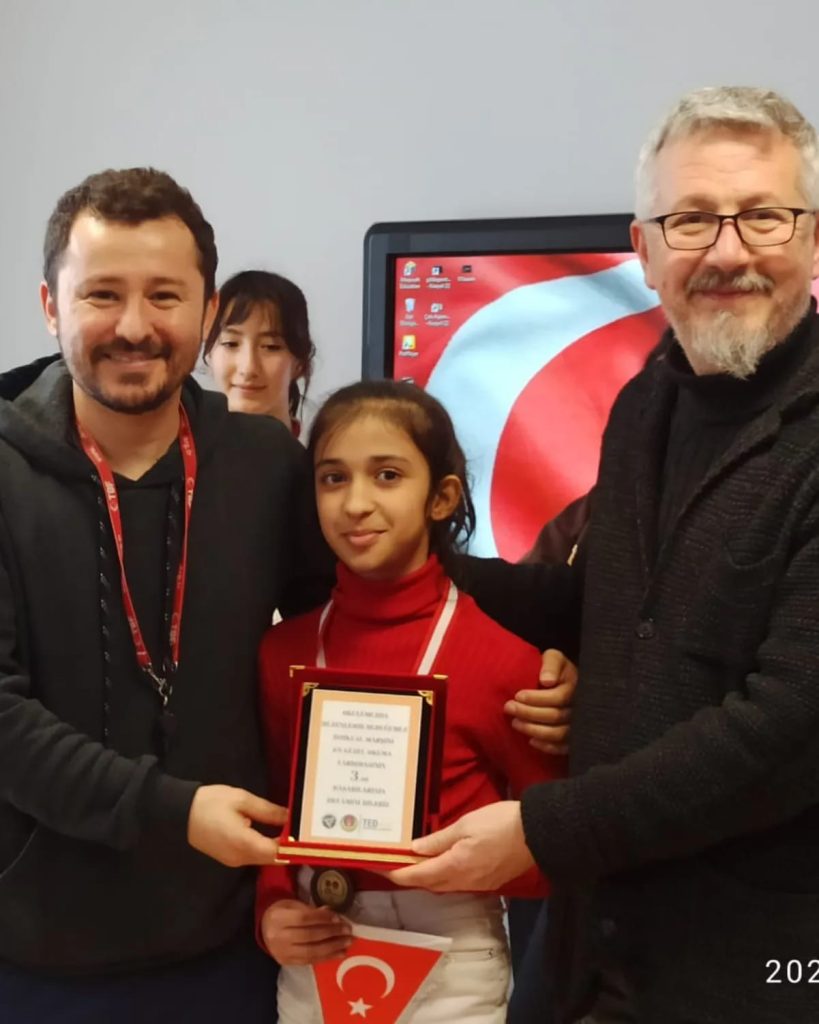Kolejin Konferans Salonunda düzenlenen etkinlikte dereceye giren öğrencilere madalya, öğretmenlerine plaket verilirken, tüm öğrencilere ise Türk bayrağı hediye edildi.