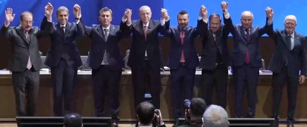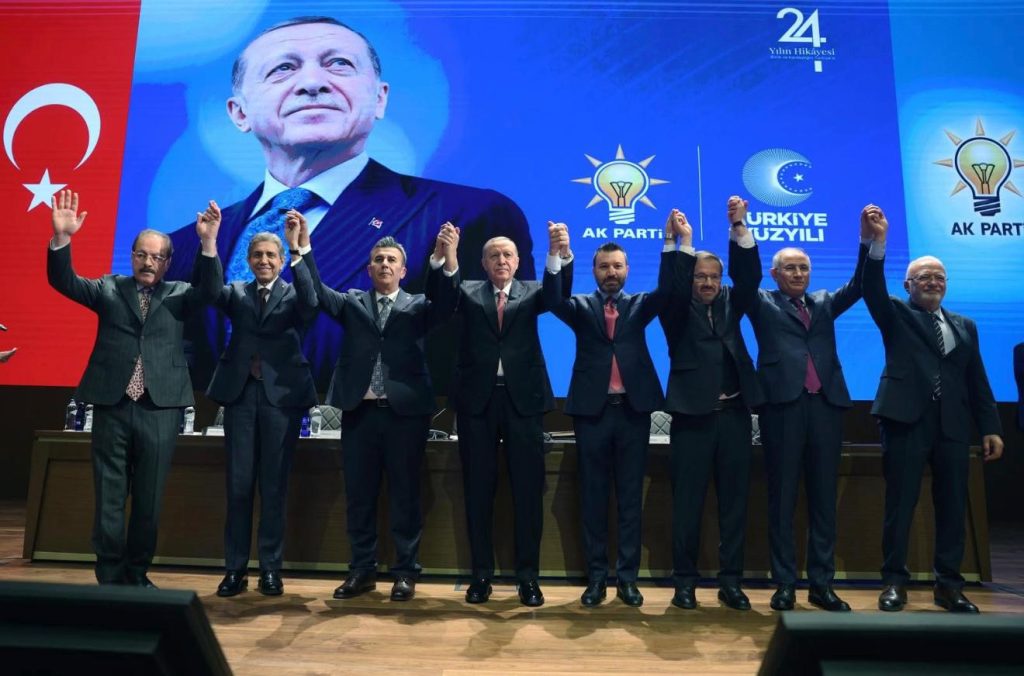 Toplantı başlamadan önce düzenlenen törende, farklı partilerden seçilerek belediye başkanlığı görevine gelen ve yollarına AK Parti çatısı altında devam etme kararı alan isimler sahneye davet edildi. Cumhurbaşkanı Erdoğan, AK Parti ailesine katılan belediye başkanlarına rozetlerini bizzat taktı.