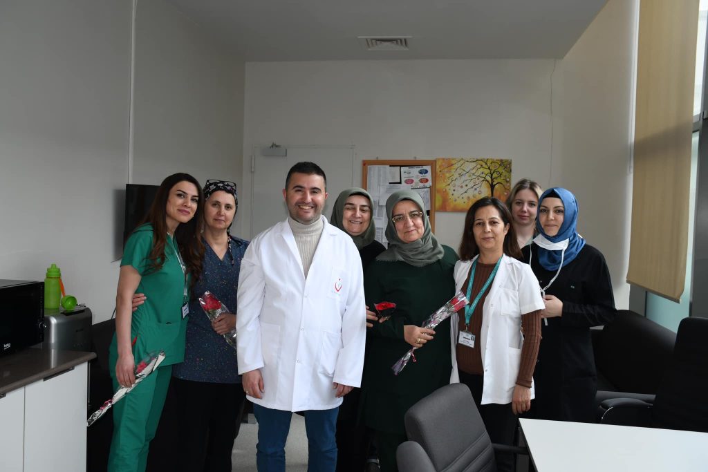 Başhekim Mustafa Kozan ve Sağlık Bakım Hizmetleri Müdürü Tinel, hastanede poliklinik ve servislerde görev yapan kadın sağlık çalışanlarını ziyaret ederek karanfil takdim ederek günlerini kutladı.