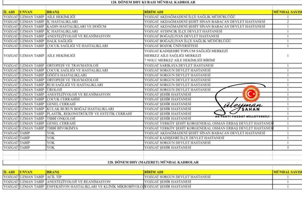 AK Parti Yozgat Milletvekili Süleyman Şahan, 128. Dönem Devlet Hizmeti Yükümlülüğü (DHY) kapsamında Yozgat’a 26 uzman hekim ve 8 pratisyen hekimin atandığını açıkladı. Toplamda 34 hekimle birlikte il genelinde sağlık hizmetlerinin kapasitesinin önemli ölçüde artması bekleniyor.