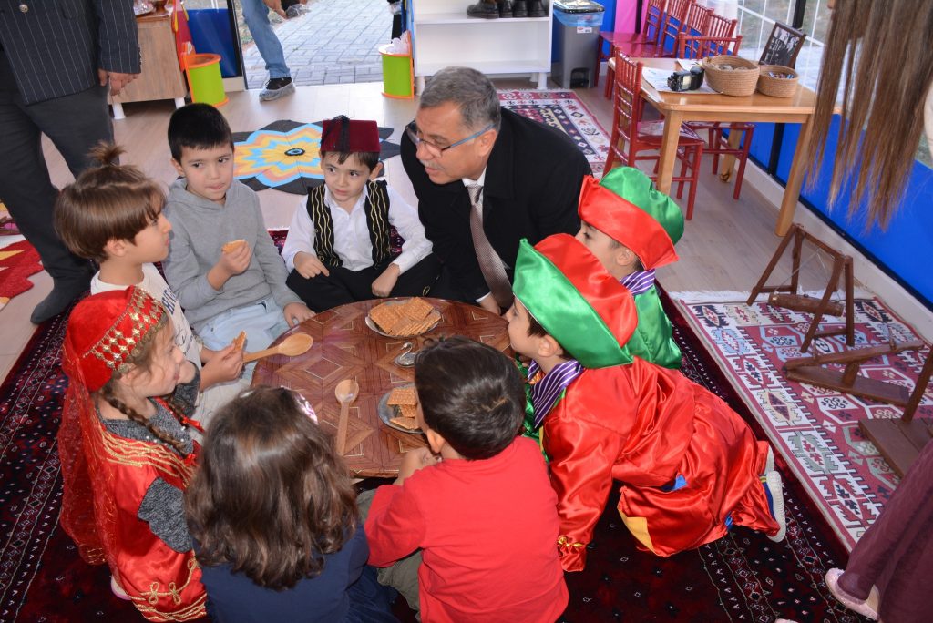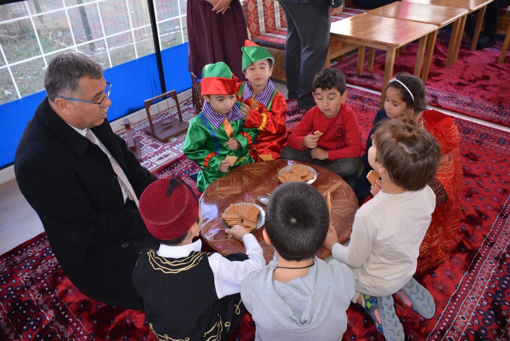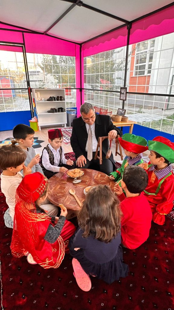 İl Müdürü Altınkaynak, minik öğrencilerle yer sofrasında bağdaş kurarak sohbet etti.