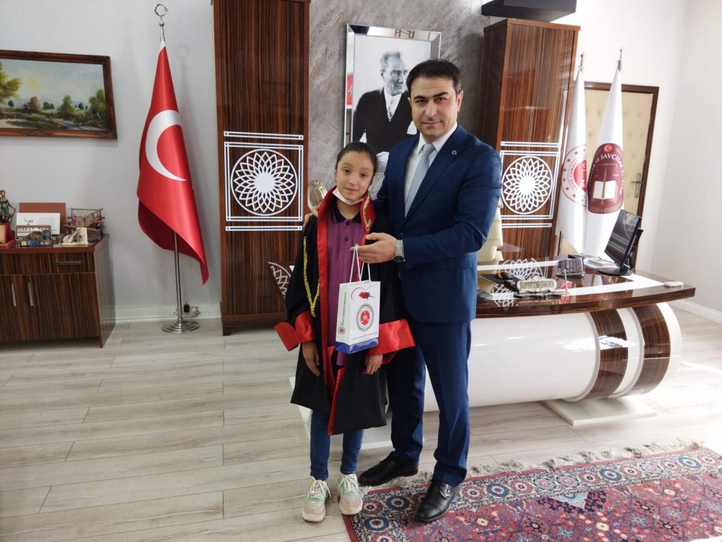 Okul Müdürü Mustafa Araplı ve Müdür Yardımcısı Sinan Özgül, eşliğinde adliyeye gelen minik öğrencileri, Başsavcı Hasan Uçak, kapıda karşıladı. Misafirlerini karşılayan Başsavcı Uçak’a minik öğrenciler çiçek takdiminde bulunarak makamı Başsavcı Uçak’tan devraldı.