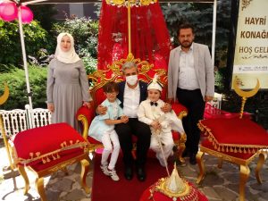 Sünnetlik kıyafeti ile önce uzun araç konvoyu eşliğinde şehir turu attırılan Mert Talha Tinel, daha sonra sünnet düğününün düzenlendiği Hayri İnal Konağına geldi.