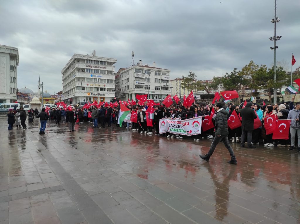 Işık Gün, “Gazze’de ve tüm dünyada ki zulmü lanetlemek için bir araya geldik. Her zaman olduğu gibi, Çanakakkle’de, Sarıkamışta olduğu gibi kar yağmur demeden bu Anadolu insanının yollara düşeceği vatanı uğruna, dini uğruna, değerleri uğruna seve seve canlarını feda edeceği ve fedakarlıkta bulunacağının bir nişanesi olarak burada toplanmış bulunuyoruz. Tüm şehitlerimize Allah’tan rahmet diliyoruz. Gazze’deki şehitlerimize Allah’tan rahmet diliyoruz. İsrail’in Amerika’nın ve benzeri ülkelerin yapmış olduğu katliamı şiddetle reddediyor, durmuyoruz. Mallarını sabote ediyor ve etmeye devam diyoruz. Ancak bu yüzden ve mazlum coğrafyaya, siz değerli öğrencilerimiz kararlı iradeli ve inançlı duruşlarıyla değerlerine sahip çıkmalarıyla zirveye ulaşacaksınız. Başarıya ulaşacaksınız diyoruz. Değerli arkadaşlar, bu zulmü alkışlamak gerçekten insanlığımıza yakışmaz. Ne yazık ki içeridekiyle dışarıdaki bazı hainler bu zulmü alkışlayabiliyorlar. Biz onlara da dur diyoruz, onlara da dur diyeceğiz. Bizim şehitlerimizin kanını akıtanlara da dur diyeceğiz. İsrail’in katliamına da dur diyeceğiz. biz hepimiz tek yürek halinde Anadolu olarak her zamanki gibi dimdik ayakta olacağız Allah’ın izniyle. Ve hiçbir zulme geçit vermeyeceğiz. Ben hepinize katılımlarınız için, destekleriniz için teşekkür ediyorum. Allah yar ve yardımcımız olsun.”dedi.
