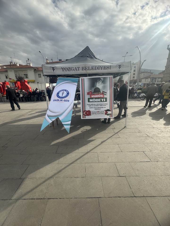 Yozgat Cumhuriyet Meydanı’nda bir araya gelen Sağlık Sen Yozgat Şubesi üyeleri, Gazze’deki insanlık dramına dikkat çekmek amacıyla Filistin’e Destek Platformu olarak nöbet tuttu.