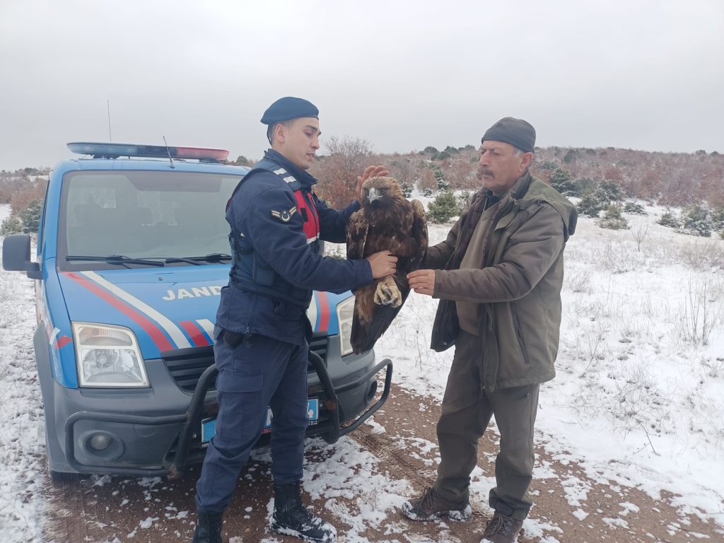 Yozgat’ın Kadışehri ilçesinde devriye görevi yapan jandarma ekipleri, Örencik köyü yakınlarında yaralı bir şah kartalını fark ederek müdahalede bulundu. Olayın ardından harekete geçen jandarma ekipleri, yaralı kartalı araçlarına aldı ve tedavi için Yozgat Doğa Koruma ve Milli Parklar İl Müdürlüğü görevlilerine teslim etti.