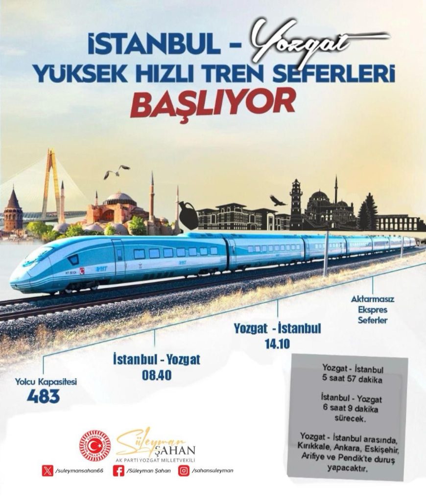 AK Parti Yozgat Milletvekili Süleyman Şahan, İstanbul-Yozgat Yüksek Hızlı Tren seferlerinin 4 Mayıs 2024 tarihinde başlayacağını duyurarak, Yozgat’a hayırlı olmasını temenni etti.