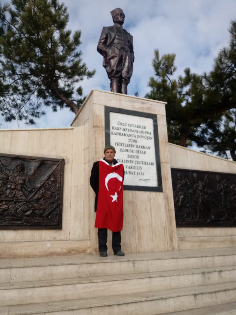 Yozgat Cumhuriyet Meydanı Atatürk Anıtı önünde üzerine aldığı Türk Bayrağı ile tek başına nöbet tutan Bekir Korkmaz, vatandaşlık görevini yerine getirmeye çalıştığını söyledi. Korkmaz, “Son günlerde sık sık şehit haberleri gelmeye başladı. Tabiki şehitlik mertbesi en önemli bir mertebedir. Türk askeri doğumdan ölüme sürekli askerdir ama. Siyasi hükümetlerin yanlışları yüzünden yani; askerlik süresinin kısaltılmas, vasıflarıyla oynanması, askeri hastanelerin kapatılması ve sözleşmeli gibi akla mantığa sığmayan Türk Silahlı Kuvvetleri’nin kadrolarının insanların bir kurbanlık gibi vatandaşımızın ekonomik ihtiyaçlarını, işsizliği aşsızlığı kullanarak çocuklarımızı buralara toplanmaları bizim canımızı acıtmaktadır. Bugün dağda 10-15 yıl eğitim gören teröristlere karşı, 3 ayda,6 ayda, 45 günde yapılaneğitimlerle cepheye sürülmesi bizim canımızı acıtmaktadır. Yapılan müdahalelere misli misli karşılık verildi terimleri bizim acımızı hafifletmiyor. Biz bunları kınıyoruz. Buradan siyaselerimize sesleniyorum. Bölge hastaneleri yeniden açılmalıdır. Ne yapayım vatandaş olarak elimden gelen budur. Siyasi bir iradem yok, mecliste bir gücüm yok dillendirecek. Yarın Allah katında huzura çıktığım zaman Allah’ım elimden gelen buydu diyeceğim. Bu vesile ile aziz şehitlerimize Allah’tan rahmet, kederli ailelerimize ve ülkemize başsağlığı diliyorum.”dedi.