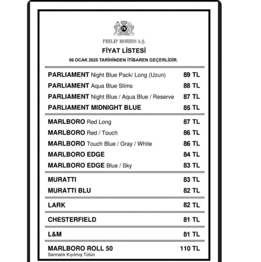 Zam sonrası, Marlbora Edge 84 TL, Marlbora Edge Blue 83 TL, Marlbora Touch 86 TL, Marlbora Red 86 TL, Parlıament 89 TL, Parlıament Aqua Blue 88 TL, Parlıament Midnight Blue 85 TL, Murattı 83 TL, Murattı Blu 82 TL, Lark 82 TL, Chesterfield 81 TL ve L&M sigaraları ise 81 TL’den satışa sunuluyor. Böylelikle, Philip Morris sigara grubuna ait en pahalı sigara markası, 89 TL fiyatıyla Parlıament Midnight Blue oldu. Tiryakiler için fiyat artışı, sigara alışkanlıklarını etkileyebilirken, özellikle pahalı markalara yönelen tüketicilerin tepkileri merak ediliyor.