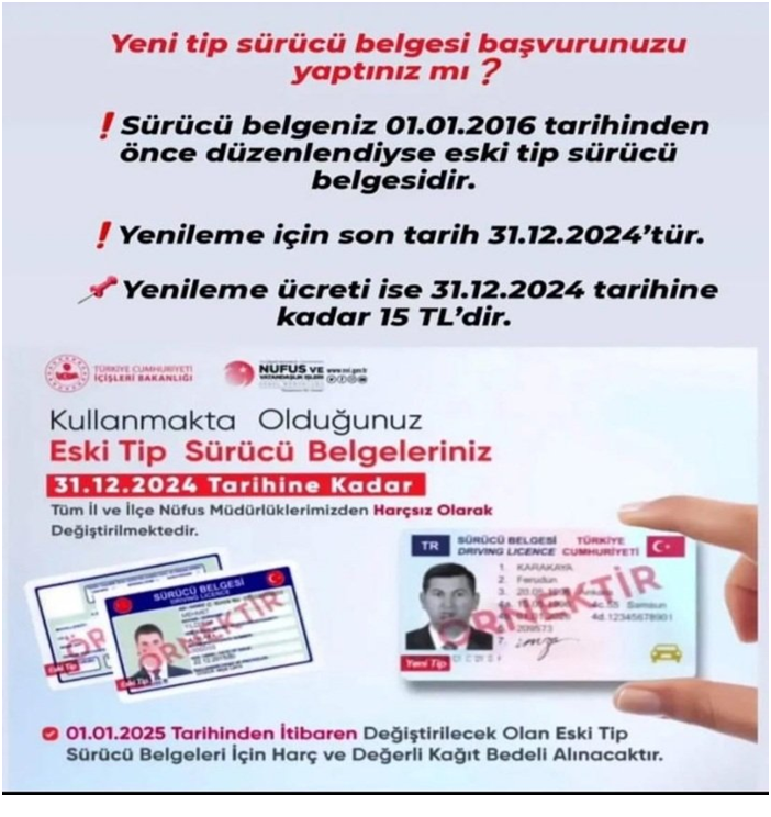 Yapılan açıklamada; şunlar kaydedildi: “01.01.2016 tarihinden önce düzenlenmiş eski tip sürücü belgelerinin yenilenmesi için son tarih 31.12.2024’tür. Bu tarihe kadar yenileme ücreti 15 TL olarak belirlenmiştir. Henüz yeni tip sürücü belgesine geçiş yapmamış sürücülerimizin mağduriyet yaşamamaları için en kısa sürede belge değişim işlemlerini tamamlamaları önemle rica olunur. Yeni sürücü belgeleri, uluslararası standartlara uygun olarak güvenlik açısından daha yüksek koruma sunmaktadır. Eski belgeler yıl sonundan itibaren geçersiz sayılacak, dolayısıyla tüm sürücülerimizin vakit kaybetmeden nüfus müdürlüklerine başvurarak belgelerini yenilemeleri gerekmektedir. 01.01.2025 tarihinden itibaren eski belgelerin değiştirilmesi durumunda harç ve değerli kağıt bedeli alınacaktır. Başvurunuzu yapmak için randevu almayı unutmayınız ve sürecin son günlerine kalmadan işlemlerinizi tamamlayınız. Ayrıca, Türkiye Cumhuriyeti Kimlik Kartı Projesi kapsamında eski nüfus cüzdanlarını kimlik kartı ile değiştirmeyen vatandaşların başvurularının 2024 yılı sonuna kadar alınması hedeflenmektedir. Yeni çipli kimlik kartları, yüksek güvenlikli çip teknolojisi ile donatılmış olup, kimlik doğrulama işlemlerinde büyük kolaylık sağlamaktadır. Eski kimlik kartlarını yıl sonuna kadar yenilemeyen vatandaşlar, ilerleyen dönemde noterler, hastaneler, tapu müdürlükleri ve bankalar gibi resmi kurumlarda sorun yaşayabilirler. Başvurularınızı zamanında yaparak olası mağduriyetlerin önüne geçmek için randevu almayı unutmayınız.”