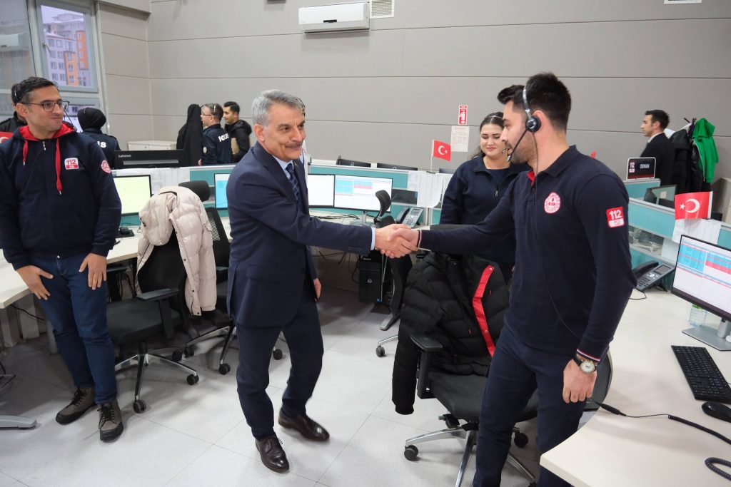 Daha sonra 112 Acil Çağrı Merkezi Müdürlüğü’nü ziyaret eden Vali Özkan, yeni yılı görev başında karşılayan personelin yeni yılını kutlayarak çalışmalarında kolaylıklar diledi. Vatandaşların huzur ve güvenliği için 7/24 esasına göre görev yapan personele teşekkür etti.