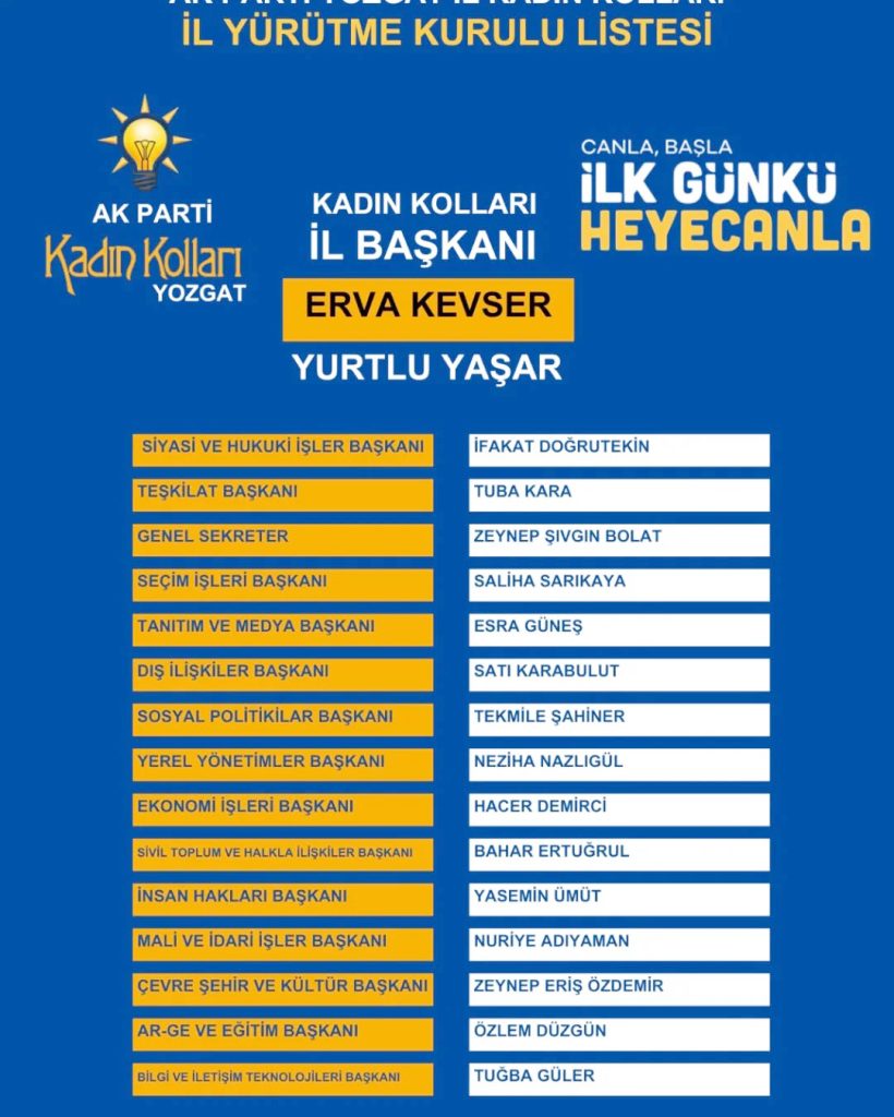 Bilgi ve İletişim Teknolojileri Başkanı: Tuğba Güler Başkan Yurtlu Yaşar, bu yeni dönemde kadının gücünü siyasete daha fazla katma ve Yozgat’taki kadınların sosyal ve siyasal hayatına dair katkılar sağlamak adına kadın kolları yönetimi olarak büyük bir sorumluluk üstlendiklerini söyledi. Yaşar, yeni yönetim kurulunun, il genelinde çeşitli projelerle vatandaşlara daha iyi hizmet sunmayı hedeflediklerini ifade etti.