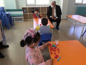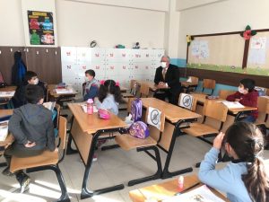 Yazıcı Milli Eğitim Vakfı İlkokulu ve Kazım Nuran Dokuyucu Anaokuluna giderek, öğrencileri sınıflarında ziyaret etti.