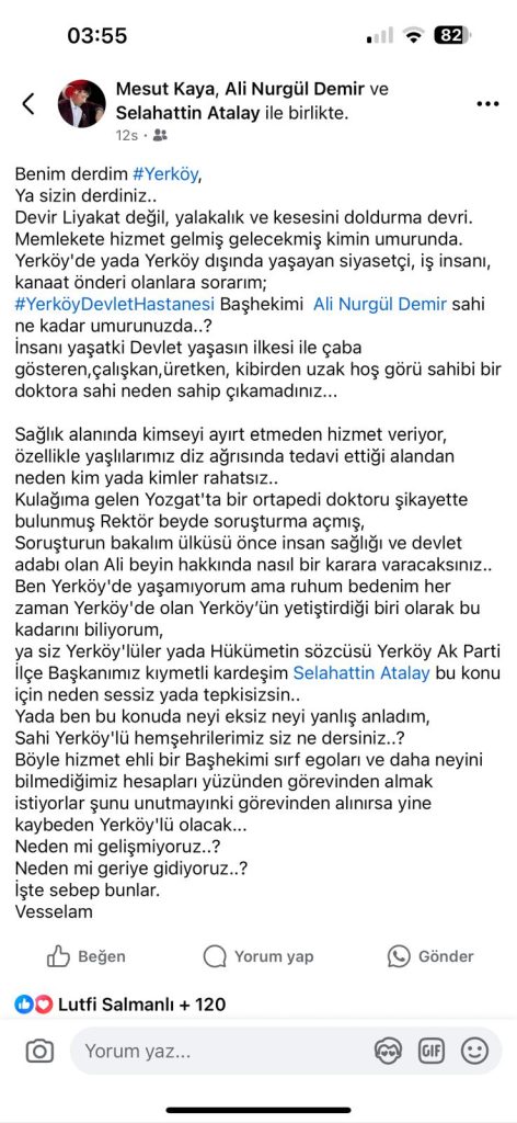 Hüseyin Torun: Yerköy devlet hastanesi başhekimi sn.dr.Ali demir hocamız hakkında halka bedava PRP iğnesi yaptığı için bazı kişi ve kurumlar tarafından şikayette bulunulmuştur.bu iğneler dışarıda en az 8 ile 10 bin tl. ararsında.bu hastaların çoğunluğu yaşlı ve emekli bu parayı verecek durumları da yok.Dr.Ali hocam bu insanlara bedava yaptığı için çekemeyen insanlar şikayette bulunmuşlar.herkesin çok çok iyi bildiği,sevdiği, tanıdığı bir hizmet insanını şikayet etmek akla ziyandır,neymiş parasız iğne yapıyor kabahat bu.onun için yerköy,çiçekdağı aşığı olan kıymetli hocamıza bütün hemşehrilerimizin Dr.Ali hocamıza destek olmaya çağırıyoruz..Selamlar…