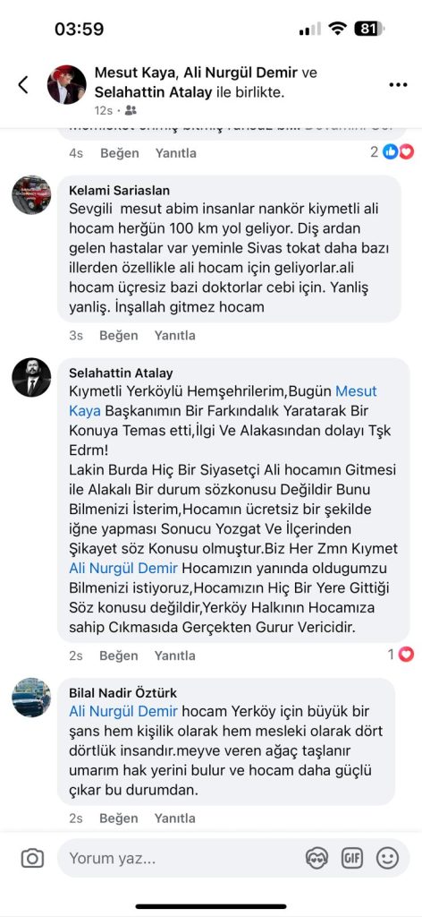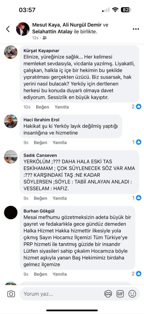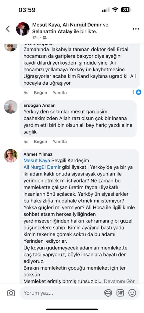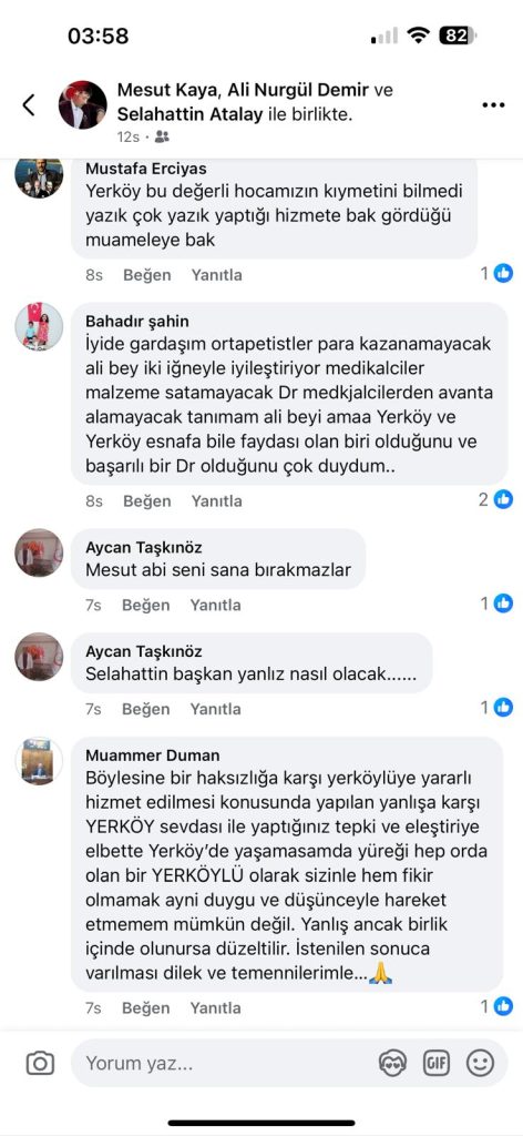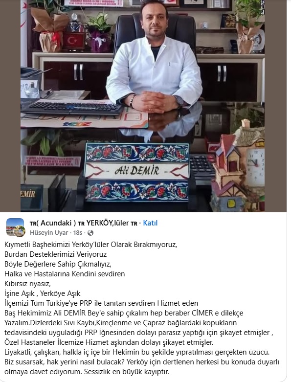 Yerköy Şehit Korgeneral Osman Erbaş Devlet Hastanesi Başhekimi Uz. Dr. Ali Demir’e, art niyetli bir kurum yöneticisi tarafından başlatıldığı iddia edilen karalama kampanyası sonrası, ilçe halkı adeta kenetlendi. Ücretsiz iğne uyguladığı gerekçesiyle başlatılan soruşturma sosyal medyada tepkilere yol açtı. Yerköy sosyal medya grupları ve vatandaşlar topyekün hareket ederek CİMER başta olmak üzere Sağlık Bakanlığı’nı da etiketleyerek yüzlerce paylaşımlar yaptı.