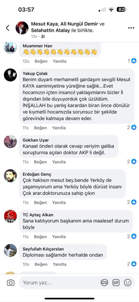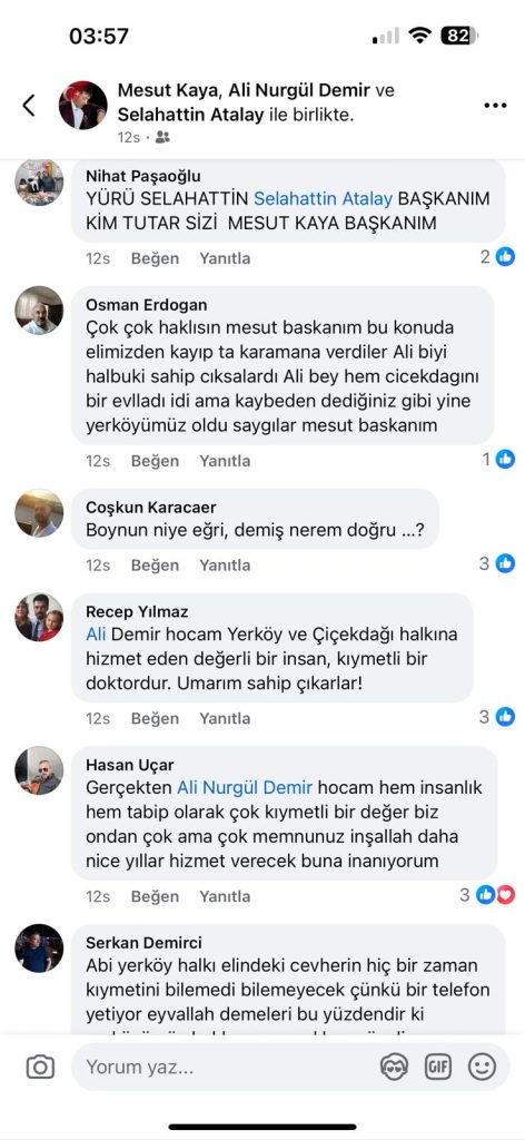 Vatandaşların çağrılarına cevap veren AK Parti Yerköy İlçe Başkanı Selahattin Atalay, sosyal medya hesabından yaptığı açıklamada, “Başhekimimiz Ali Bey görevinin başındadır, biz de her zaman yanındayız. Hiçbir siyasetçinin hocamızın gitmesiyle ilgili bir durumu söz konusu değildir. Yerköy halkının hocamıza sahip çıkması gurur vericidir” dedi.