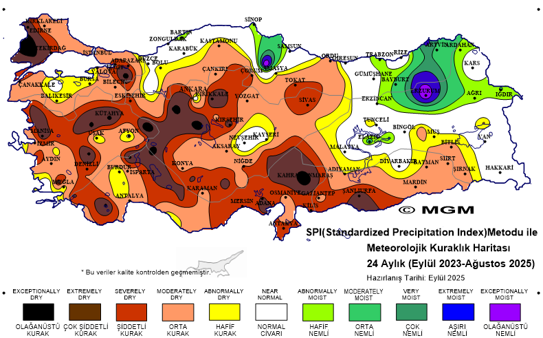 Meteoroloji Genel Müdürlüğü (MGM), Ağustos 2024 – Temmuz 2025 dönemini kapsayan 12 aylık meteorolojik kuraklık haritasını yayımladı. Harita, Türkiye’nin büyük bir bölümünde ciddi kuraklık riskinin etkili olduğunu ortaya koydu.