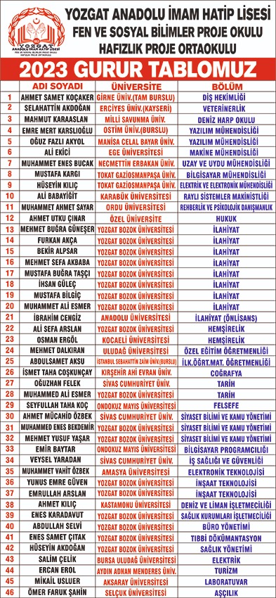 Yozgat Anadolu İmam Hatip Lisesi Fen ve Sosyal Bilimler Proje Okulu, 46 öğrencisinin YKS sonuçlarıyla gurur duyuyor. Bu öğrenciler, sınavda elde ettikleri başarıyla  üniversite yerleştirme sonuçlarında tıp, mühendislik, hukuk, veterinerlik gibi prestijli bölümlere yerleşmeye hak kazandılar. Öğrencilerin bu başarıları, okulun eğitim kalitesi ve öğretmenlerin özverili çalışmalarının bir sonucu olarak öne çıkıyor.