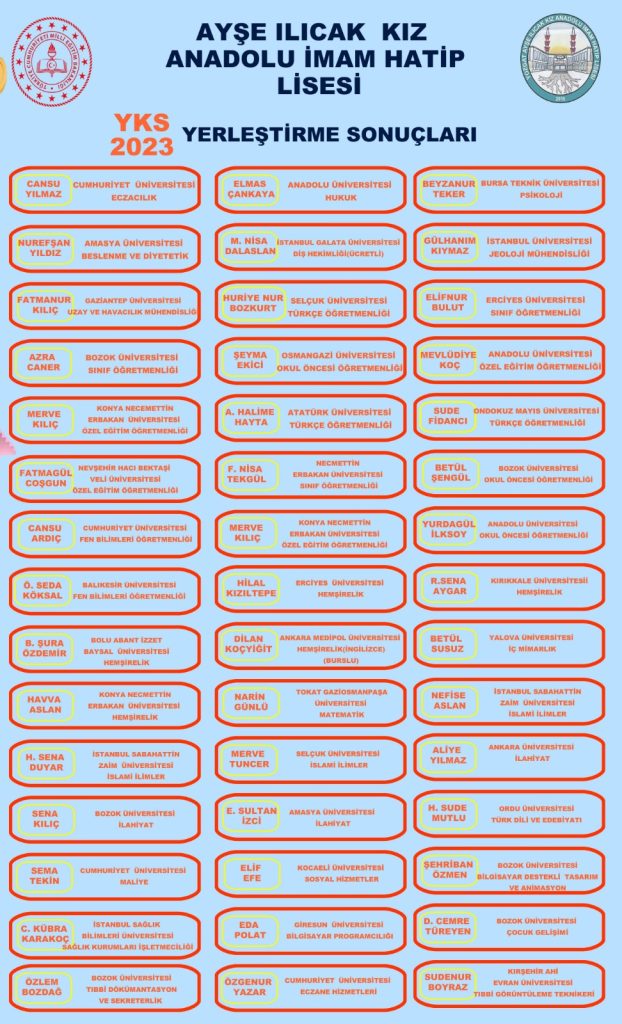 Ayşe Ilıcak Kız İmam Hatip Lisesi ise Yozgat’ta bir diğer önemli başarı hikayesini temsil ediyor. Okuldan mezun olan 44 öğrenci, YKS’de  gösterdikleri performansla tıp, hukuk, mühendislik gibi stratejik ve talep gören bölümlere yerleşmeye hak kazandılar.