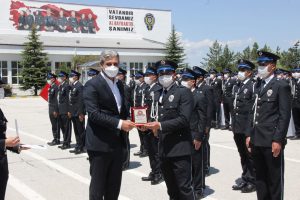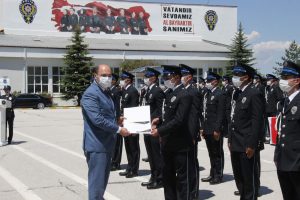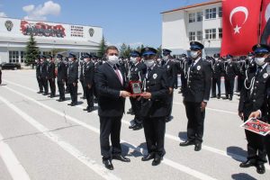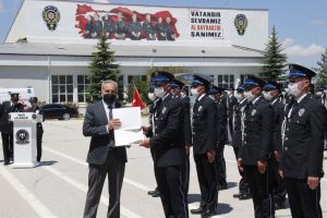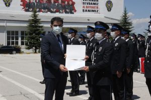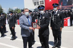 Yozgat Polis Meslek Eğitim Merkezi tören alanında gerçekleştirilen 26. Dönem POMEM Mezuniyet Töreni, Saygı duruşun ve İstiklal Marşı’nın okunmasıyla başladı. Programda okulunu derece ile bitiren Ali Çakır, yaş kütüğüne plaket çaktı.