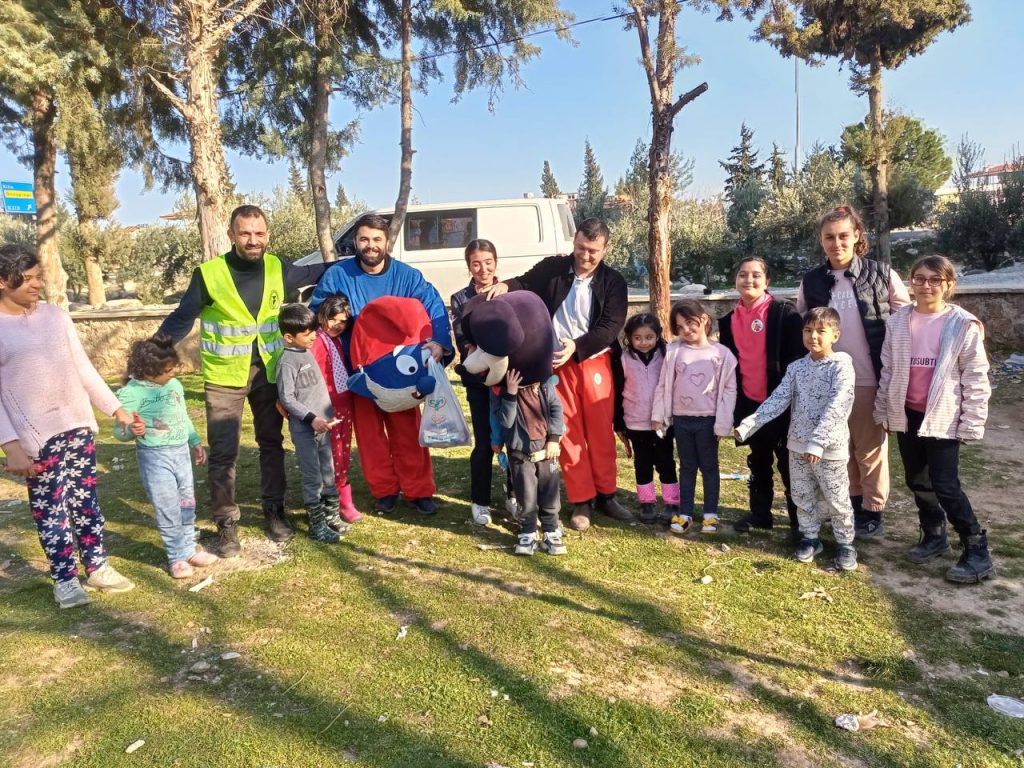 Çocuklara çikolata, çeşitli yiyecek, oyuncak ve balon dağıtan gençler, çizgi film karakteri kostümleriyle çocuklara oyunlar oynatarak eğlenceli vakit geçirmelerini sağlıyor.