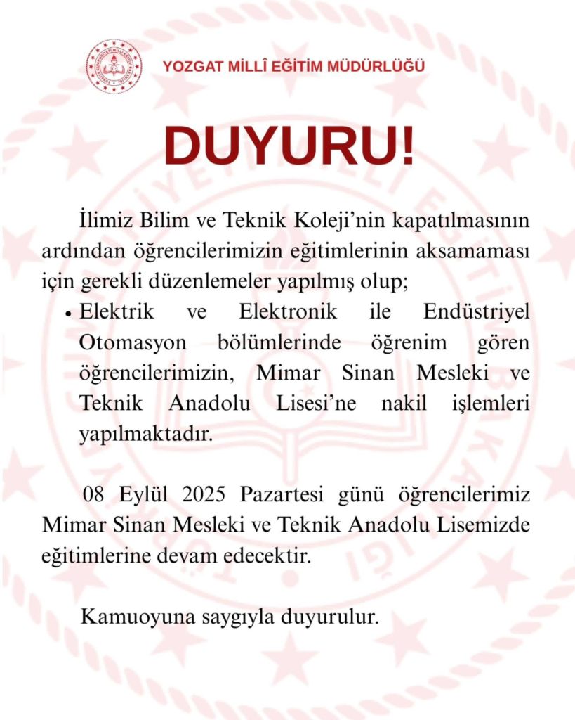 İl Milli Eğitim Müdürlüğünden yapılan resmi açıklamaya göre, Bilim Teknik Koleji’nde öğrenim gören öğrenciler, Mimar Sinan Mesleki ve Teknik Anadolu Lisesi’ne nakledildi. Bu kapsamda Elektrik-Elektronik ve Endüstriyel Otomasyon bölümleri, Mimar Sinan Mesleki ve Teknik Anadolu Lisesi bünyesinde açılarak öğrencilerin eğitimlerine kesintisiz devam etmeleri sağlandı. İl Milli Eğitim Müdürlüğü, “Öğrencilerimizin eğitim hakkının kesintiye uğramaması ve velilerimizin mağdur olmaması adına tüm planlamalar titizlikle yapılmıştır. 8 Eylül 2025 Pazartesi günü itibarıyla öğrencilerimiz yeni okullarında eğitimlerine başlayacaktır. Kamuoyuna saygıyla duyurulur” ifadelerine yer verildi.