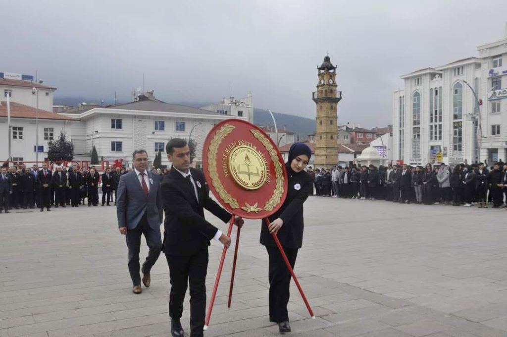 Program, Yozgat İl Milli Eğitim Müdürü İsmail Altınkaynak’ın Atatürk Anıtı’na çelenk sunumuyla başladı. Ardından, saygı duruşu İstiklal Marşı okundu.