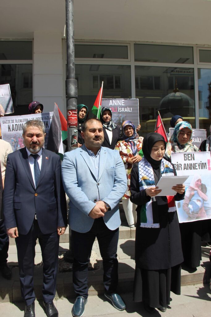 Kadın Kolları İl Başkanı Erva Kevser Yurtlu, basın açıklamasında İsrail tarafından Filistin’de katledilen annelere değindi.